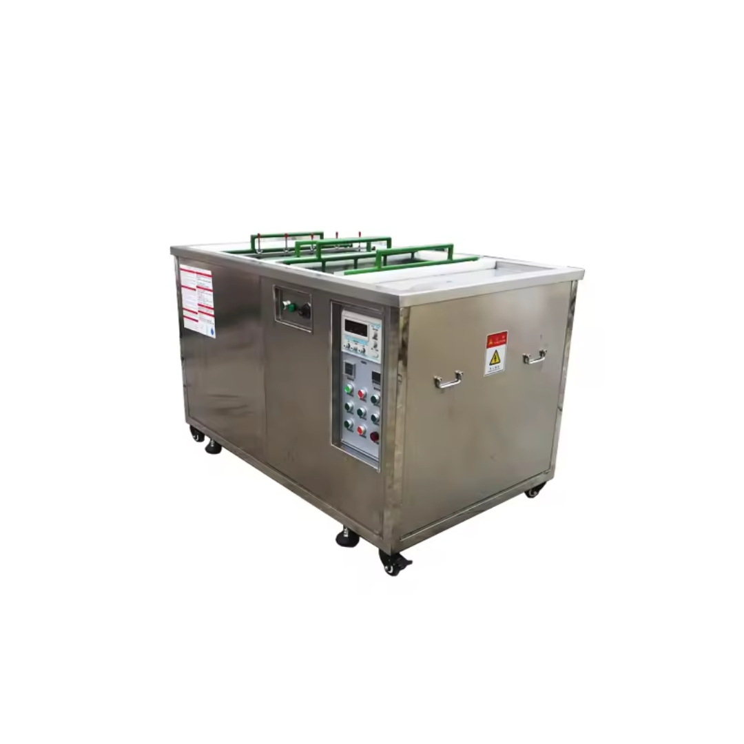 Ultrasonic Mold Cleaning Device that cleans the parts via multi-stage ultrasonic cleaning and rinsing procedures. Rinsing is performed using ultra-pure DM water, subsequently followed by drying via IR, hot air, and curing stations. An ultrasonic cleaning procedure utilizing an ultrasonic cleaning machine signifies top-notch cleaning of diverse industrial parts. Hot air, IR, and vacuum drying processes are used after ultrasonic cleaning.
